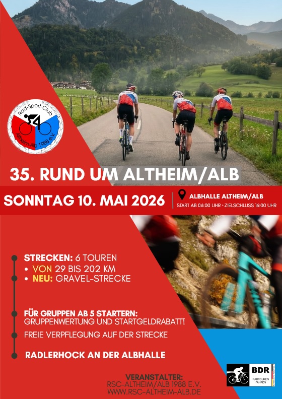 Auf gut ausgeschilderten Strecken führen wir unsere Touren von Altheim aus durch das malerische Eselsburger Tal, über die Schwäbische Alb, durch das Lautertal und vorbei an den reizvollen Höhen und Tälern der Alb wieder zurück nach Altheim. |